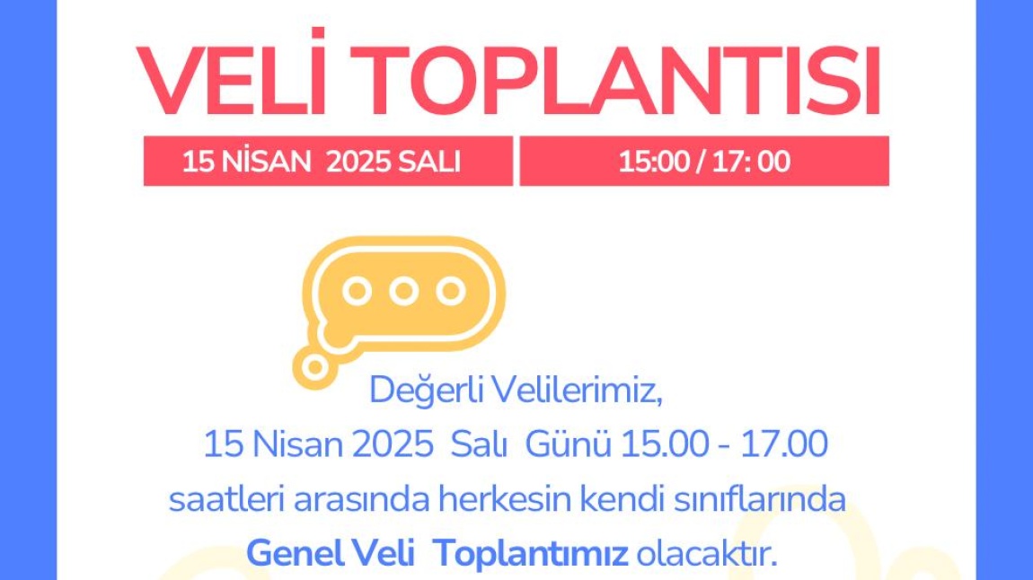 15.04.2025 salı günü saat 15.00-17.00 arasında okulumuzda genel veli toplantısı yapılacaktır. Tüm velilerimizin katılımını önemle rica ederiz.